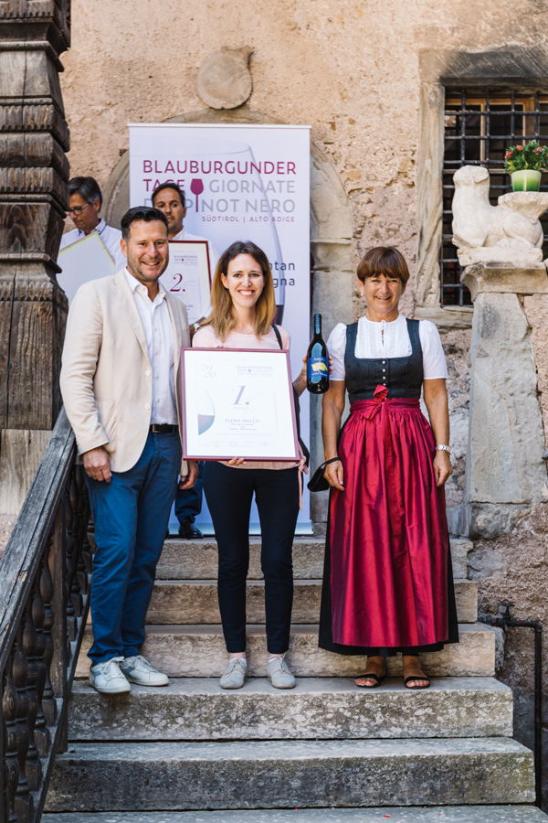 Sieger des 19. Nationalen Blauburgunderwettbewerbs – Jahrgang 2017 ist das Weingut Elena Walch mit dem Pinot Nero Ludwig – im Bild Julia Walch mit Horst Pichler (BM Neumarkt) und Monika Delvai Hilber (BM Montan)