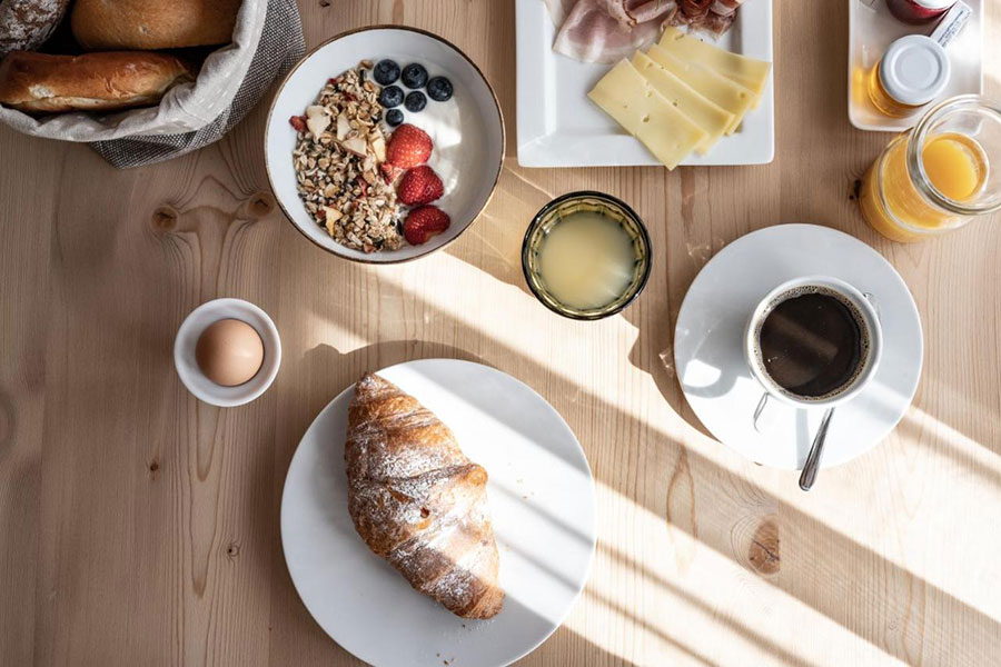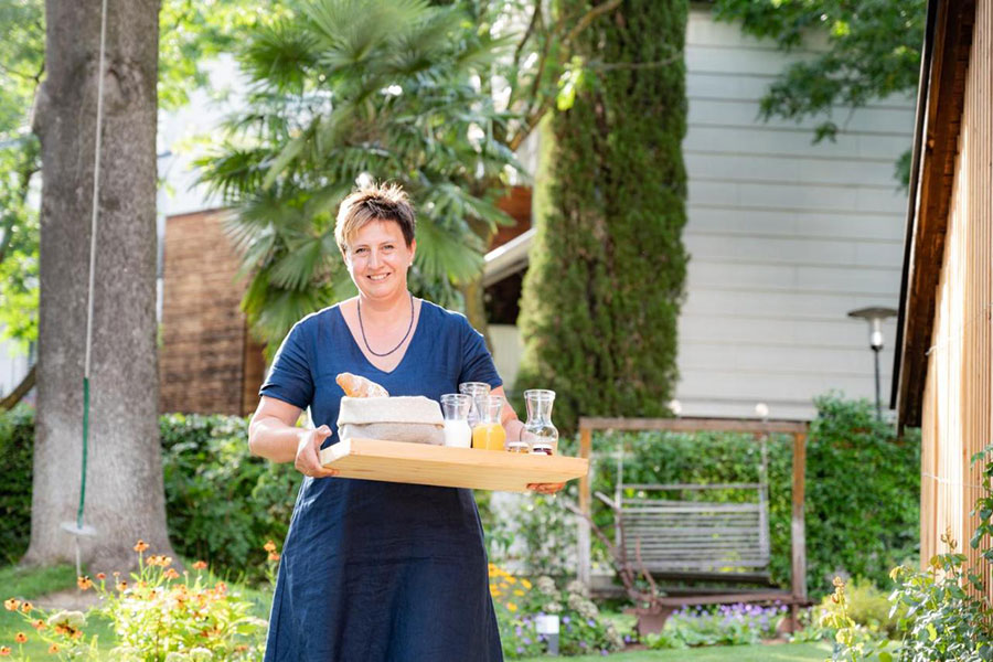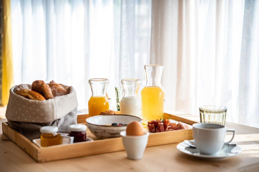 Die Gäste können zwischen Frühstückskörben und einem Buffet im Verkostungskeller wählen, das mit hofeigenen Produkten und frischen Lebensmitteln von kleinen Manufakturen und Erzeugern aus der näheren Umgebung bestückt ist. Zur Auswahl stehen Kaffee oder Kräutertee, saisonales Obst und Gemüse aus dem eigenen Garten, selbstgemachte Marmelade und Honig, knuspriges Brot und selbstgemachtes Müsli und andere Köstlichkeiten wie Wurst, Käse, Frischkäse und Aufstriche, Eierspeisen und Trockenfrüchte.