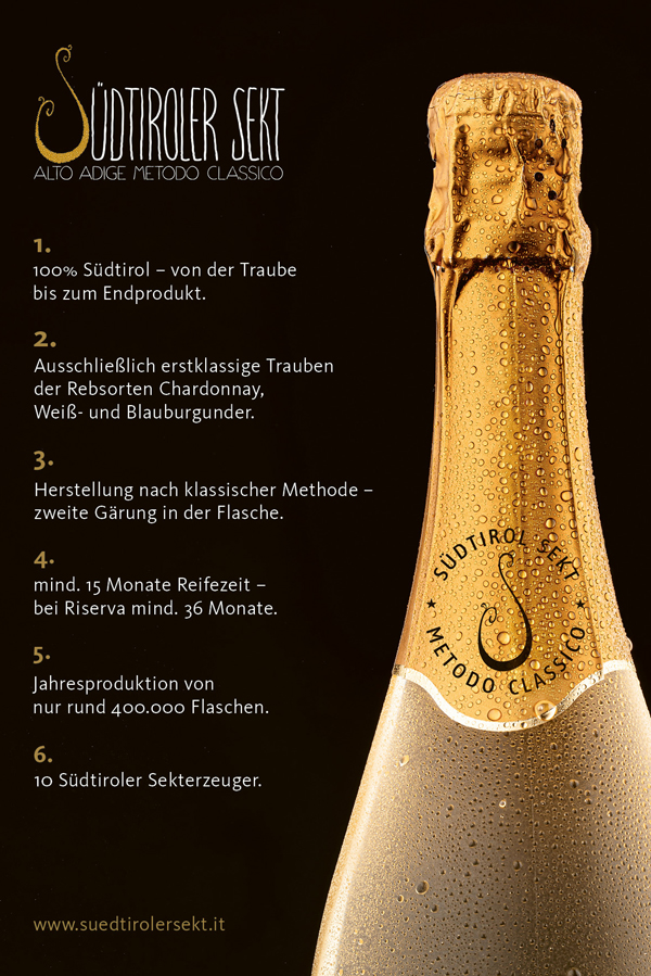 „Südtirol Sekt“ bringt zum Ausdruck, dass in der Flasche 100% Südtirol perlt, von der Traube bis zum Endprodukt. Nur erstklassige Trauben aus Südtirol und ausschließlich der Rebsorten Chardonnay, Weiß- und Blauburgunder dürfen verwendet werden und die gesamte Erzeugung muss in Südtirol vonstattengehen.