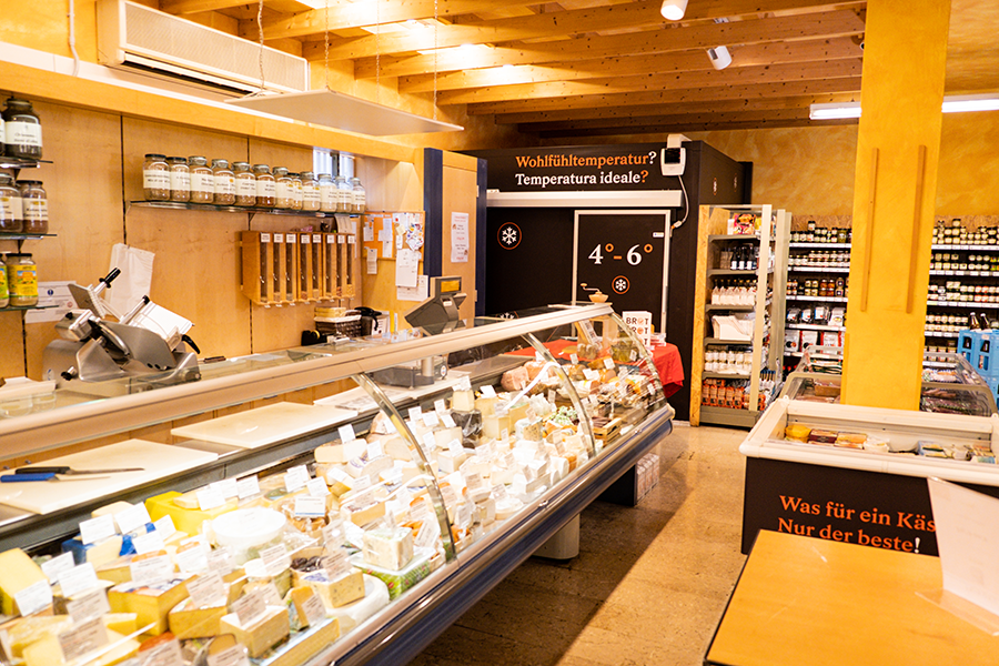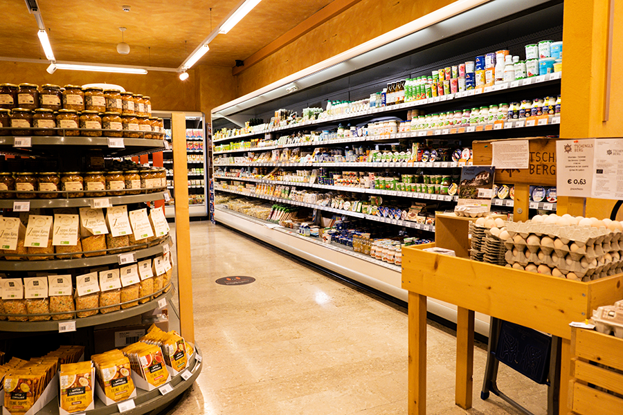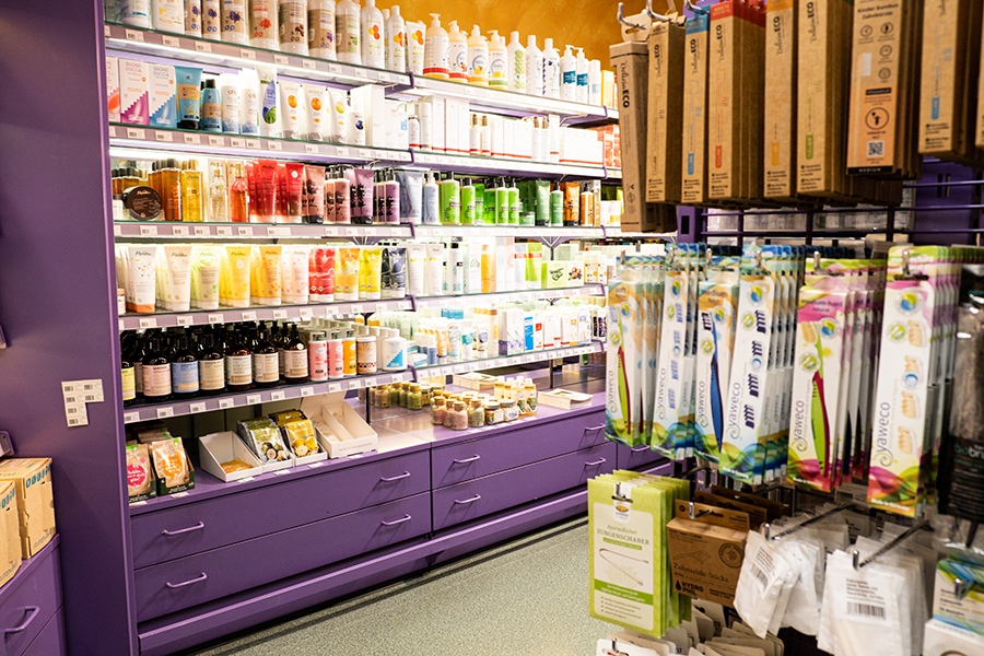 Eine großzügige Theke bietet Frischwaren in allen erdenklichen Varianten an; Kosmetikartikel und natürliche Pflegeprodukte für den Körper findet der Kunde im gekennzeichneten Bereich.