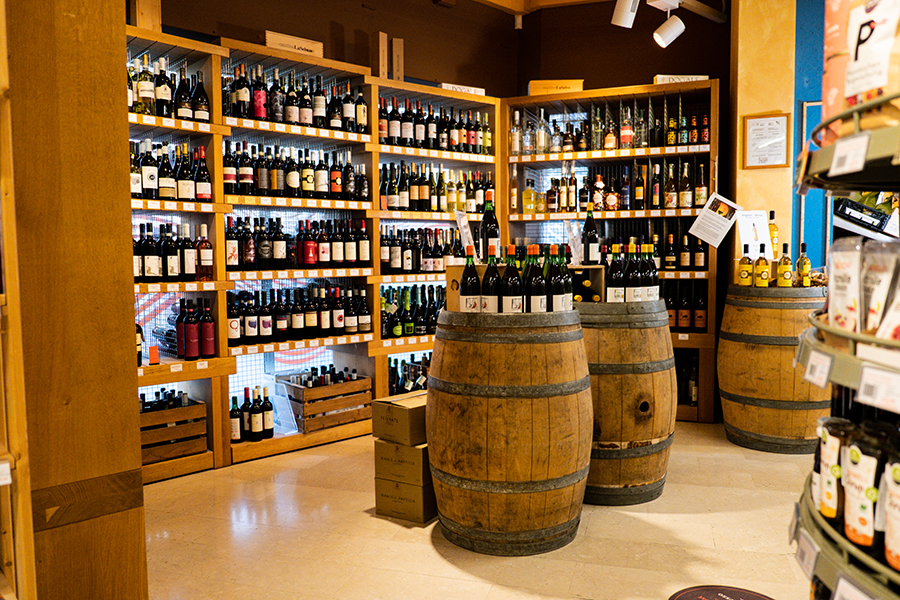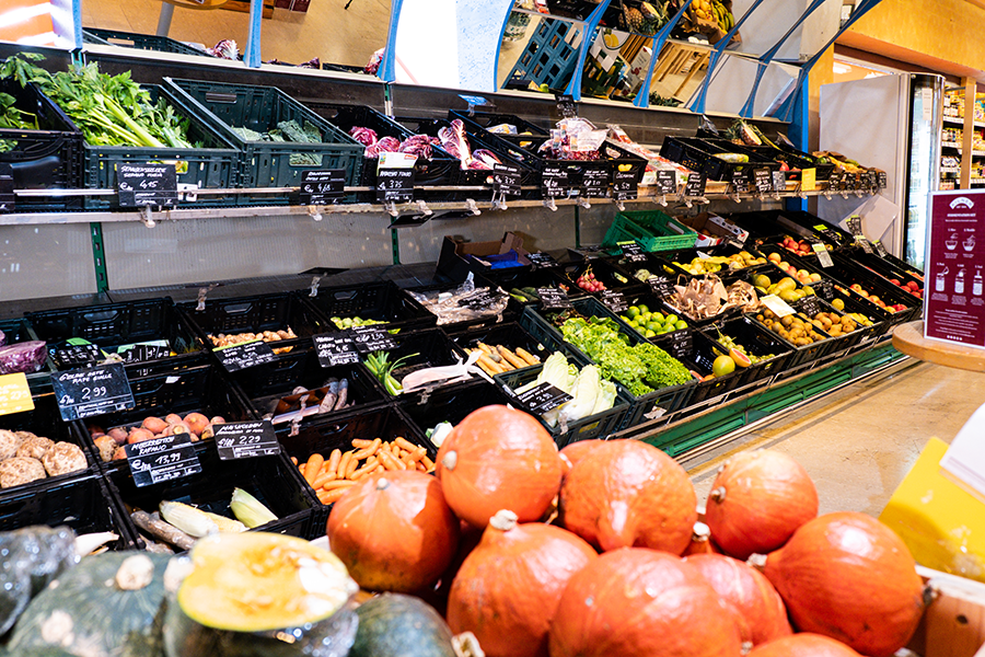 Einzelne Abteilungen verführen mit sorgfältig angeordneten Produkten. Bio-Obst und Bio- Gemüse reihen sich aneinander; edle Bio-Weine, duftende Kräuter und Teesorten lassen an entspannende Stunden denken.