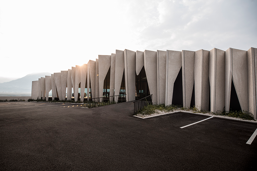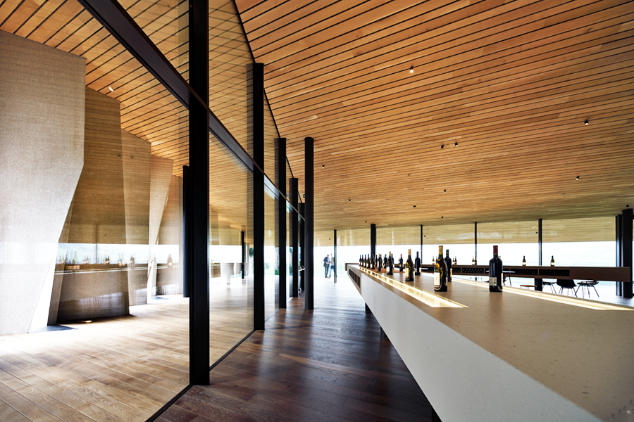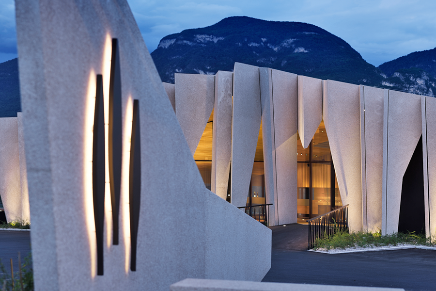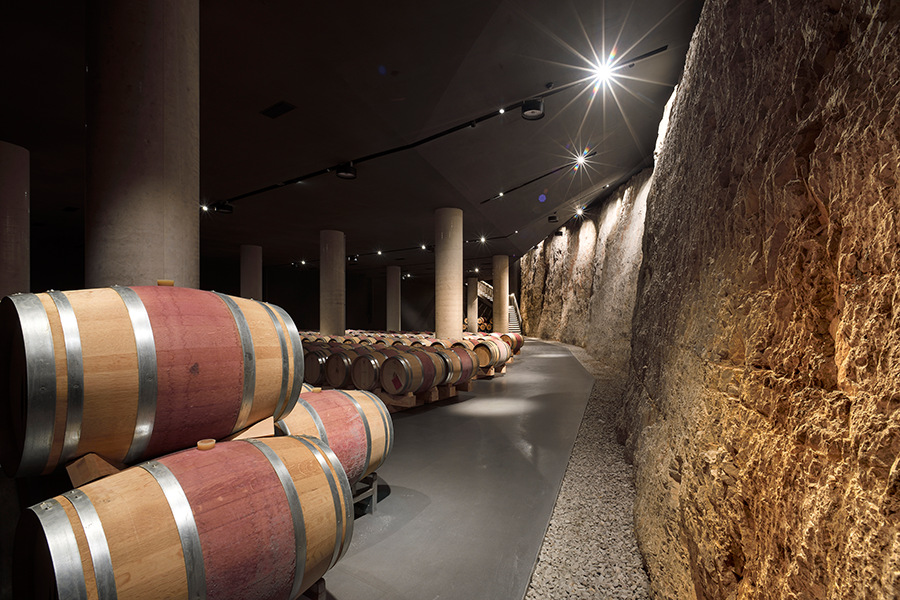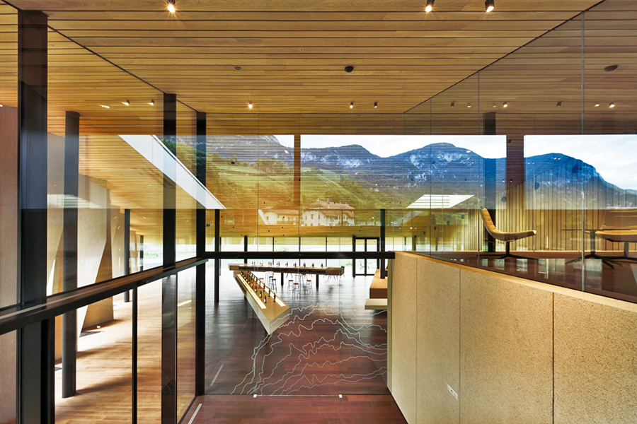 Le pareti Milla in dolomite che plasmano il panorama di Cortaccia e caratterizzano i vini della Cantina Kurtatsch hanno forgiato anche la forma, il colore e i materiali dell'architettura. Nella barricaia la parete Milla costituisce addirittura il muro di fondo in dolomite.