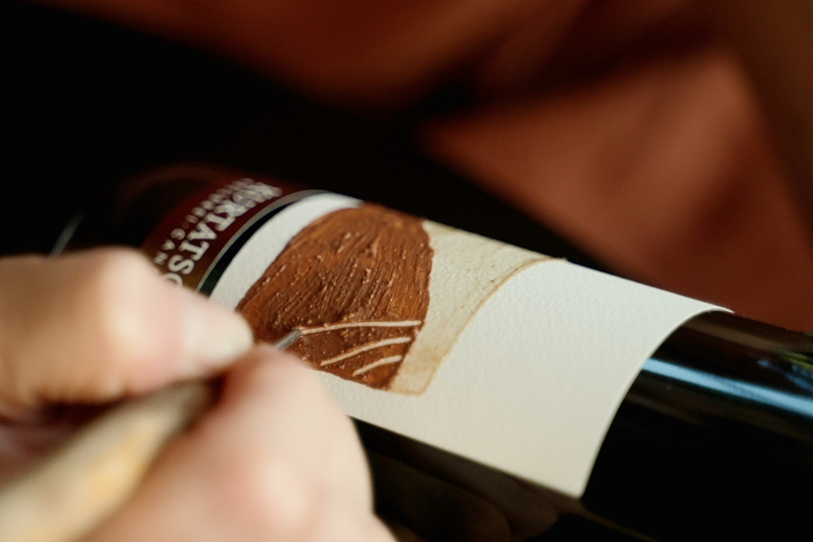 Attraverso una selezione meticolosa dei vari elementi trovati nel terreno multistrato dei vigneti, l'artista ha sperimentato con i diversi spettri di colore e impatti materici; i singoli componenti sono poi stati macinati a mano in un mortaio estraendo una polvere fine che, mescolata con un legante, costituisce la base per la pittura. Un ulteriore omaggio alla terra, protagonista indiscussa della nuova cuvée.