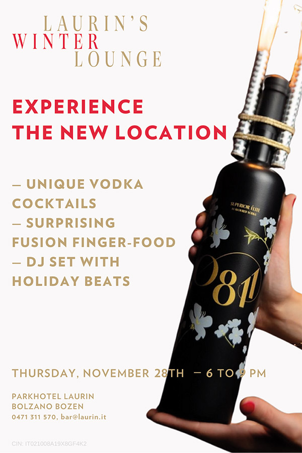 Der beheizte Raum mit transparenten Wänden, Wolldecken und warmem Licht sorgt für alpines Hüttenflair und lädt zum Verweilen ein. Hohe Tische fördern die Geselligkeit, während Feuerstellen und festliche Gin-Cocktails das Erlebnis abrunden. Draußen verzaubert der Laurin-Park mit funkelnden Kugeln und festlichen Lichtern, die die Magie der Weihnachtszeit perfekt einfangen.